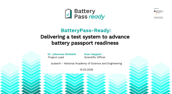 At an exchange event organized by eWAVE partner SYRION, Dr. Johannes Simböck (Project Lead) and Sven Geppert (Scientific Officer) from acatech, National Academy of Science and Engineering in Germany, presented key results of the former BatteryPass project and the current status of the BatteryPass-Ready project on 10 February 2026. There was an extremely high level of interest in this event from the eWAVE partner consortium, which also contributed actively to the relevant Q&A and discussion session.